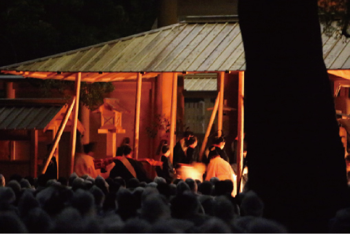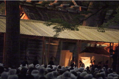 翌日奉仕する祭主・大宮司・少宮司・禰宜・禰宜代・宮掌・宮掌補・楽長・楽師・祭庭係等の奉仕員、並びに正宮等に納める御料・御装束神宝の入った唐櫃が大麻・御塩にてお祓いを受けます。皇大神宮の唐櫃は二十合、御料唐櫃は三合で白木、御装束神宝唐櫃は十七合、黒塗・朱塗で、朸「おうこ」(担ぎ棒)の無いものも有りました。