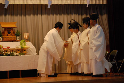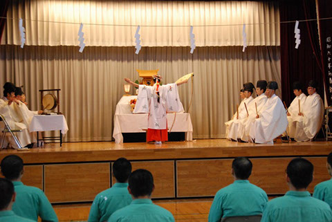 平成二十四年十二月二十一日、松本少年刑務所に於いて、長野県神社庁教誨師による教誨活動の一環として大祓式並び健康更正祈願祭が斎行されました。 少年刑務所へ着くと、鍵の掛かった扉を何ヶ所も通り斎場へ向かいました。このお祭りは奉仕させて頂いた経験があるため、何度か訪れたことはあるものの、毎回一つ一つの扉を通り抜けるごとに身が引き締まる気持ちになります。斎場では全員で舗設・習礼を済ませ式に備えました。時間になり受刑者が着席すると、始めに教誨師より大祓についての説明があり、引き続き式が始まりました。参列者数は年を追うにつれ減ってきている様な気はしますが、参列した人達は式中、物音一つ立てずに集中し、配られた人形へ神妙な面持ちで息を吹きかけ、身体を祓っている姿が見受けられ、一人一人の祭りへの意識の高さを感じることができました。その様な姿を目にし、私自身、参列者への罪・穢れが少しでも多く祓われ、清らかな心で生活出来るよう、又さらなる健康や更正を祈願しながら心を込めて奉仕し、無事に式を終える事が出来ました。 これからはより多くの受刑者が大祓式の意味をもっと理解し、心の置き所の一つとなるよう務めていきたいです。そして一日も早い社会復帰へ繋がればと心から願っております。